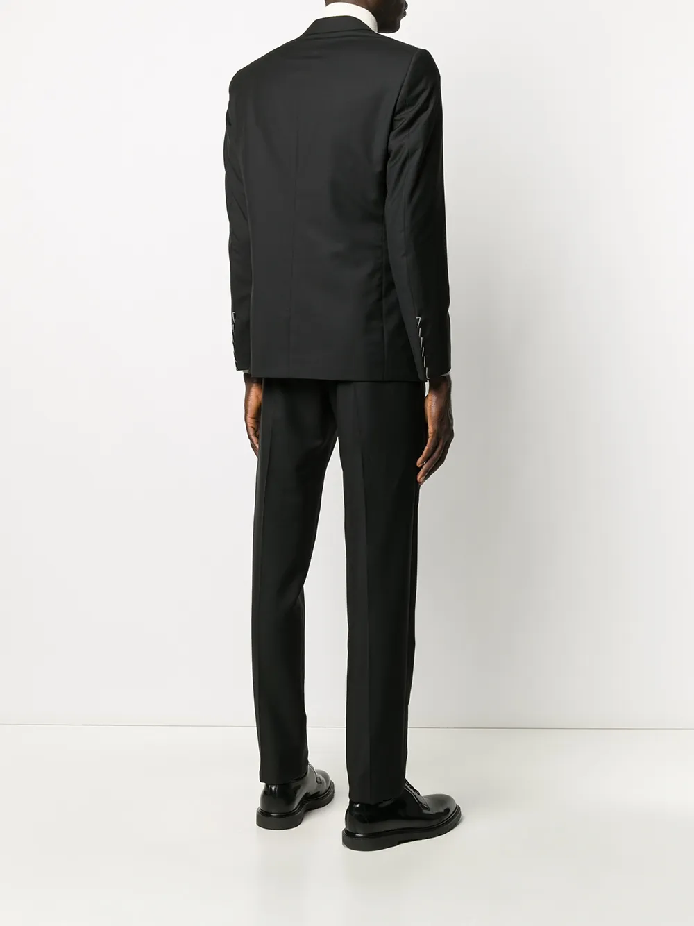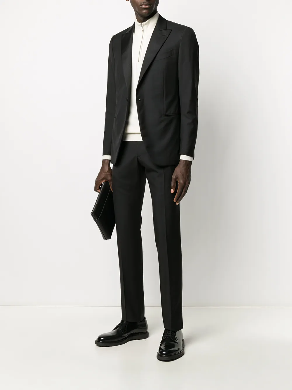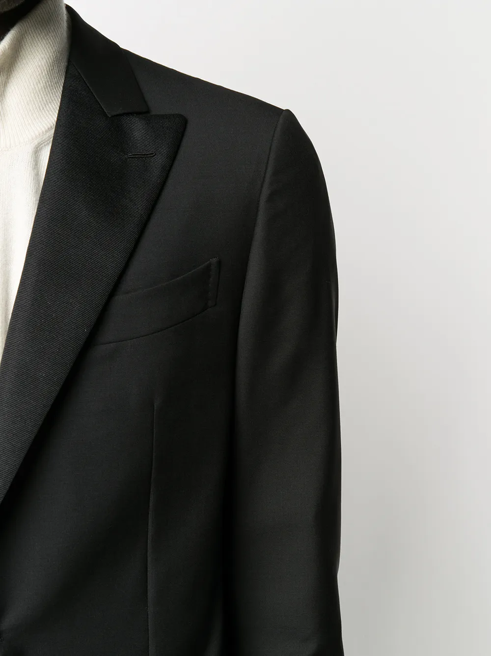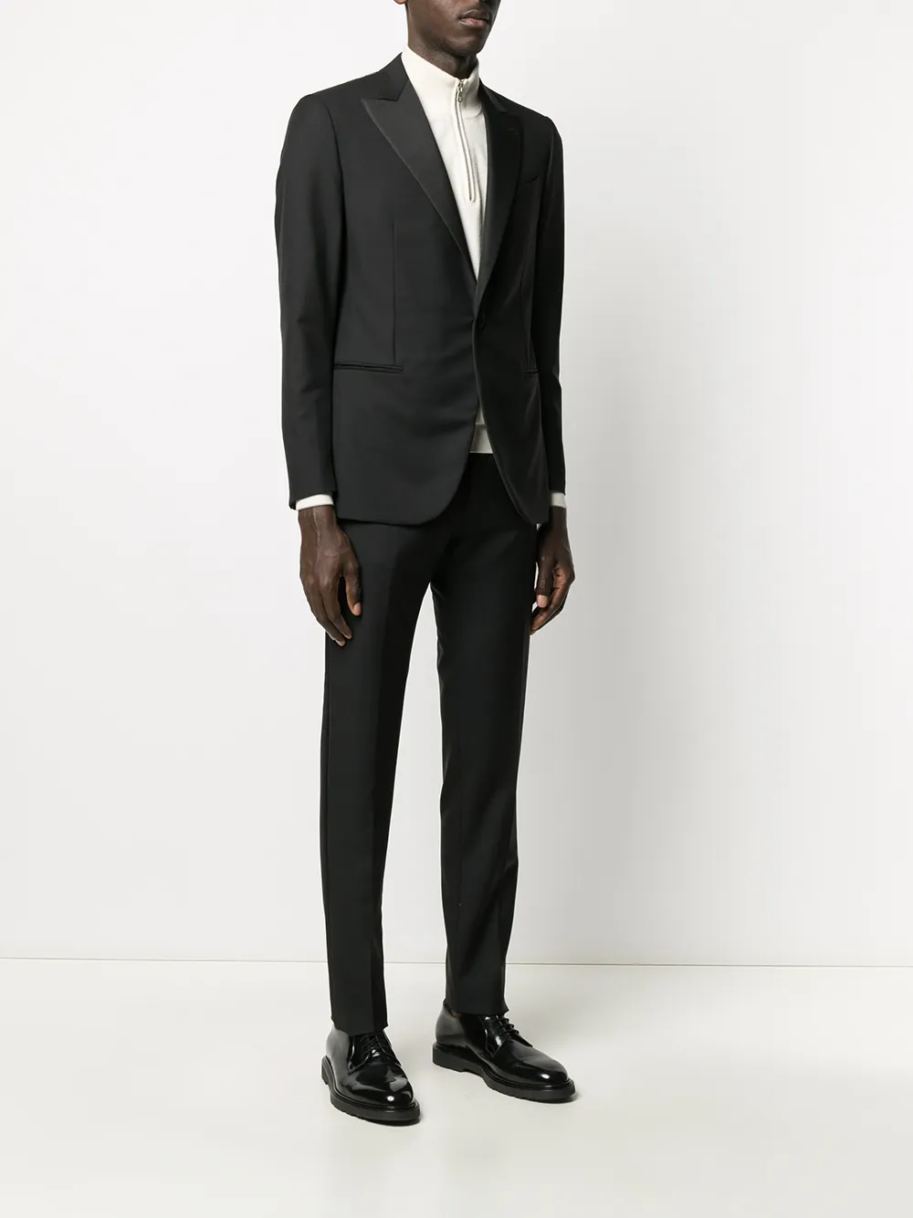 Смокинг с брюками от Caruso. Узкий крой, длинные рукава, передние карманы и цельная подкладка.