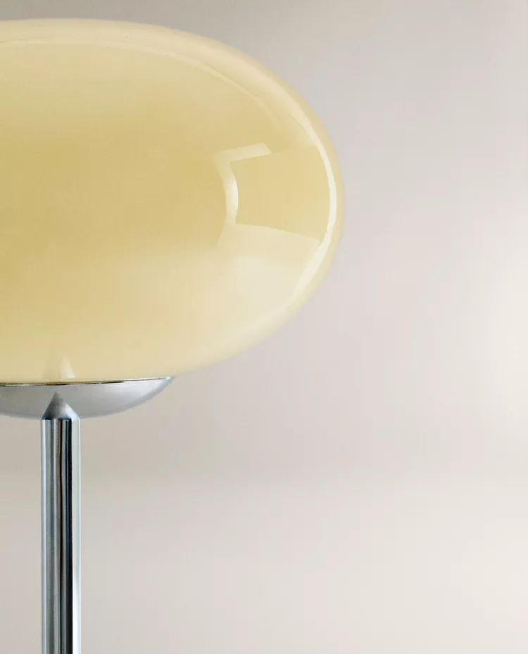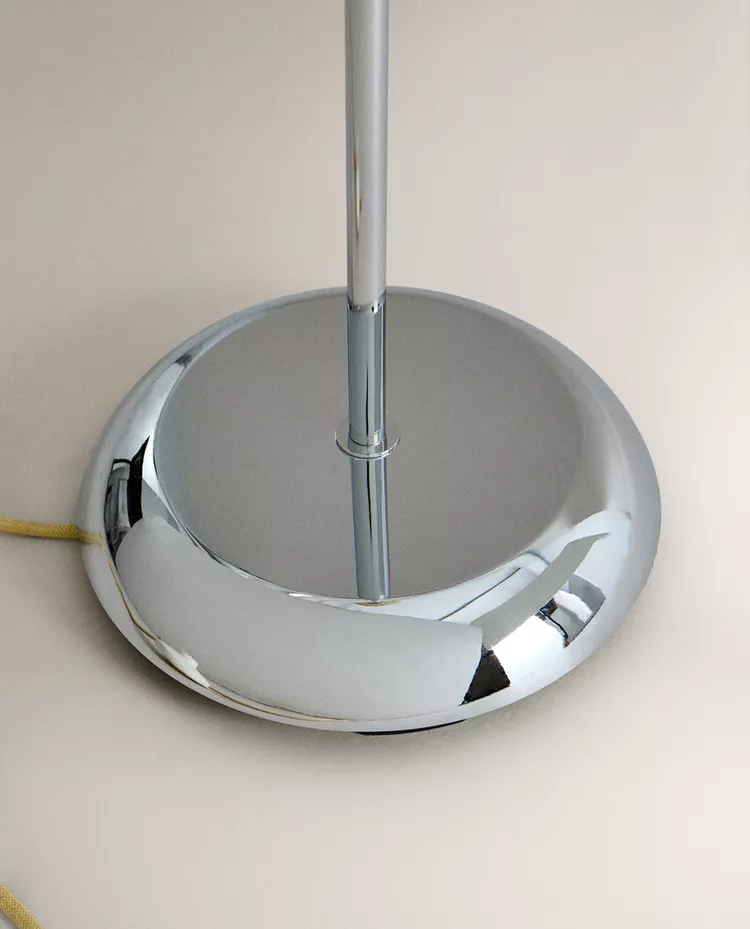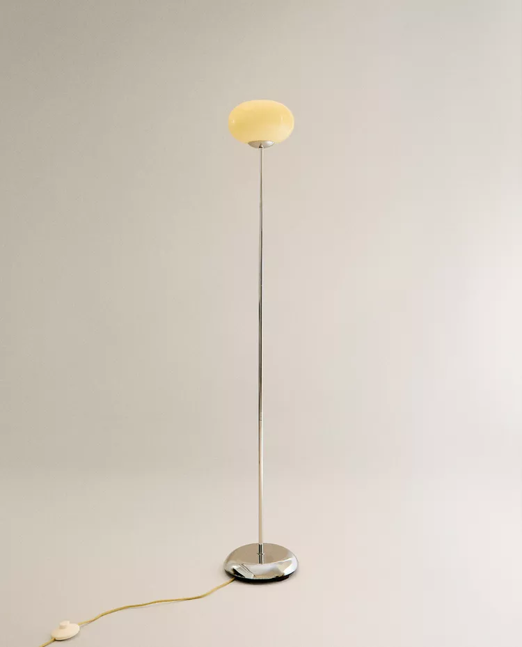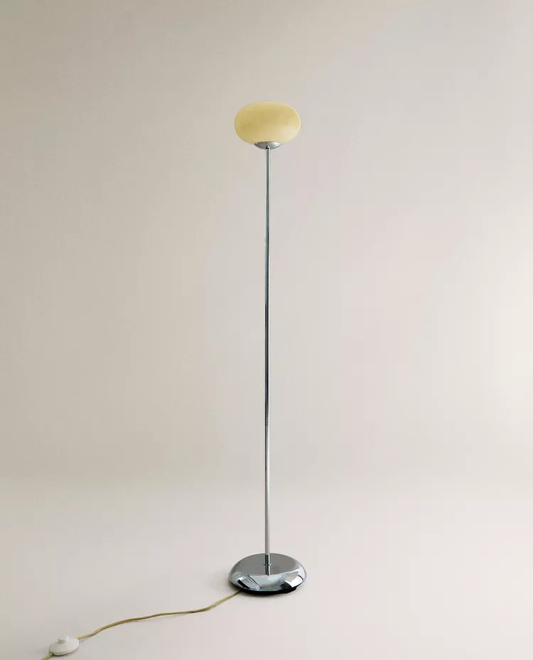 Напольная лампа из стекла и металла. Дизайн отличается изящной, минималистичной конструкцией с прочным основанием, обеспечивающим устойчивость. Абажур имеет сферическую, слегка овальную форму, напоминающую пузырь, что придает ему выразительный и современный вид.