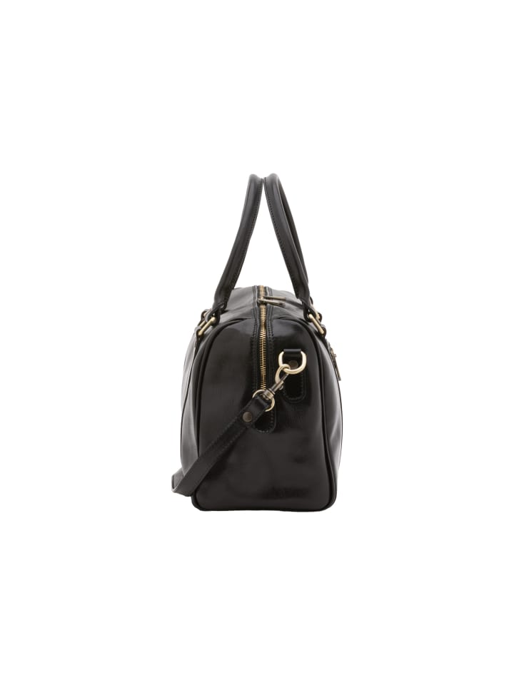 Женская сумка-боулер на молнии. Один внутренний карман на молнии. Один внешний карман на молнии сзади. Съемный кожаный плечевой ремень. Кожаная ручка. Одно внутреннее отделение. Внешний материал: натуральная кожа. Внутренняя подкладка из хлопка. Размеры: 37 x 22 x 16 см. Сделано в Италии. 37 x 22 x 16 см