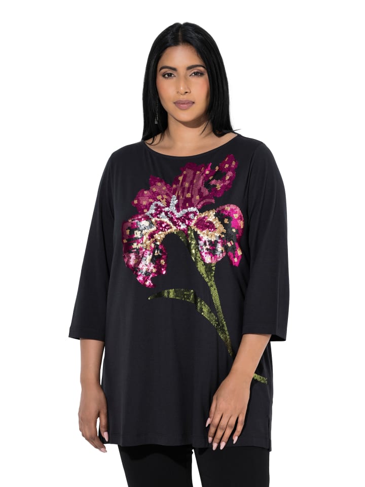 Толстовка А-силуэта из высококачественной модальной ткани с узором в виде ирисов, украшенная стразами. Вырез-лодочка, рукава три четверти. Боковые разрезы для дополнительного комфорта.