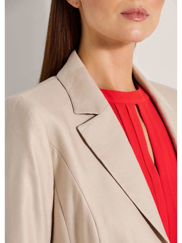Модный короткий блейзер, впечатляющий своей элегантностью и комфортом. Смесь льна и вискозы имеет приятную текстуру и удобна в носке благодаря добавлению эластичных волокон. Слегка приталенный крой, декоративные швы и тонкая окантовка с внутренней стороны демонстрируют тщательное внимание к деталям. Отложной лацкан, встроенные накладные карманы и длинные рукава с планками на пуговицах дополняют этот классический однобортный блейзер. Длина около 58 см, выше бедер. Модный короткий блейзер. Стиль на каждый день. Материал: 50% ацетат, 27% лен, 18% вискоза, 4% полиэстер, 1% эластан.