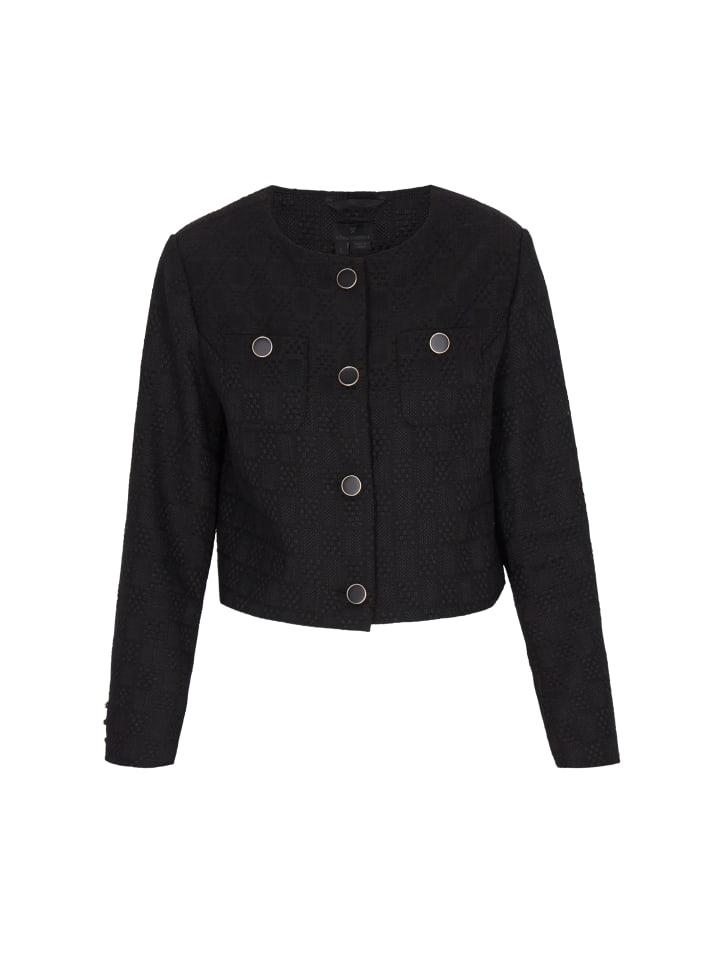 Стильный блейзер прямого кроя укороченной длины, идеально подчеркивающий силуэт и придающий образу современную элегантность. Классический и шикарный дизайн с круглым вырезом и длинными рукавами. Застегивается на кнопки и имеет практичные нагрудные карманы, сочетая функциональность и изысканный стиль. Изготовленный из тканого материала с текстурированным узором, блейзер идеально подходит как для повседневной носки, так и для торжественных мероприятий. Его вневременной дизайн делает его прекрасным дополнением к классической коллекции, превращая его в универсальный элемент гардероба.
