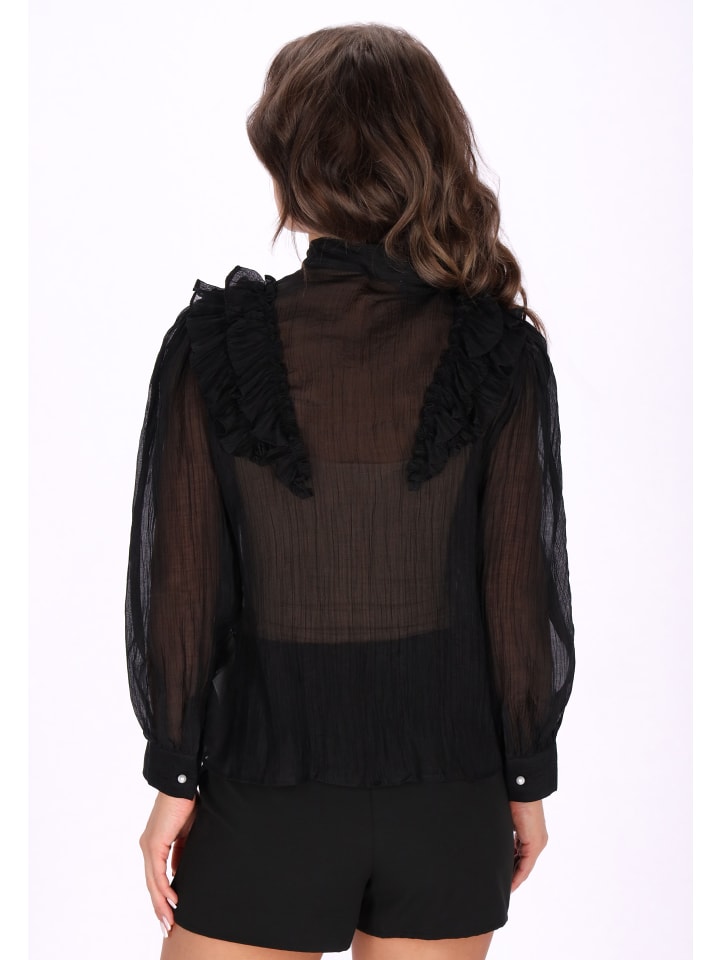 Эта блузка из коллекции Faina сочетает в себе изящество и элегантность. Изготовленная из легкого шифона, она имеет свободный крой для комфорта. Нежный воротник-бант и оборки добавляют романтики. Длинные рукава-епископ с изящными манжетами и застежка на пуговицы обеспечивают стильную посадку. Простой, однотонный крой делает эту блузку идеальной для торжественных и праздничных случаев.