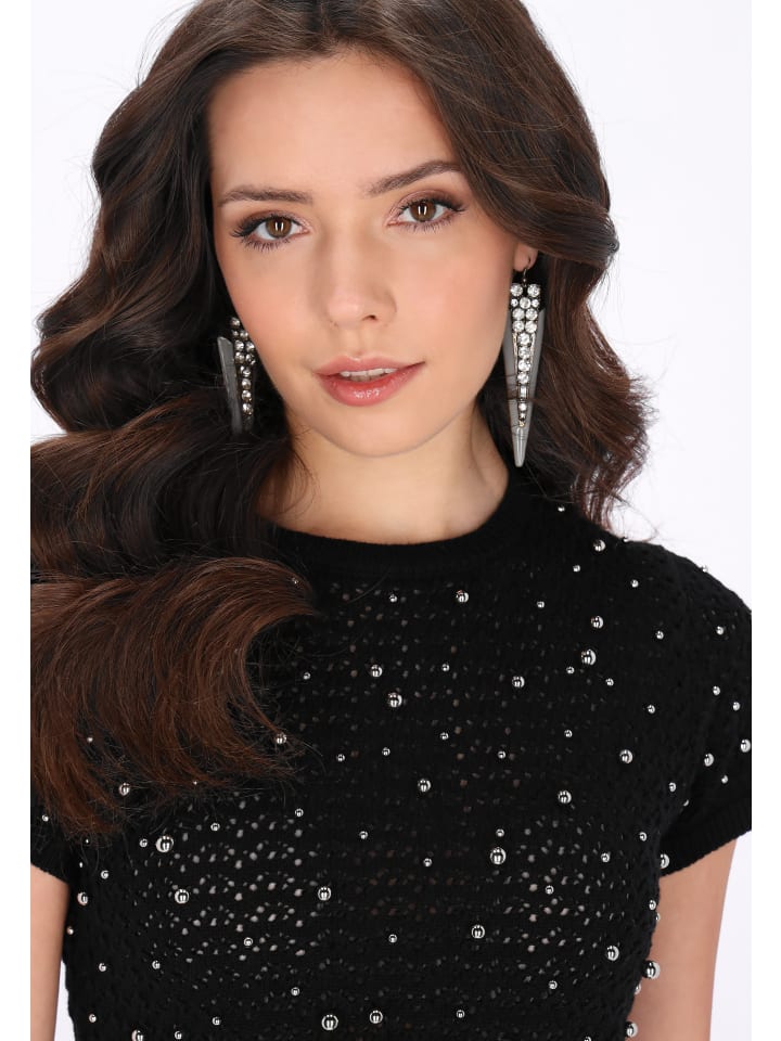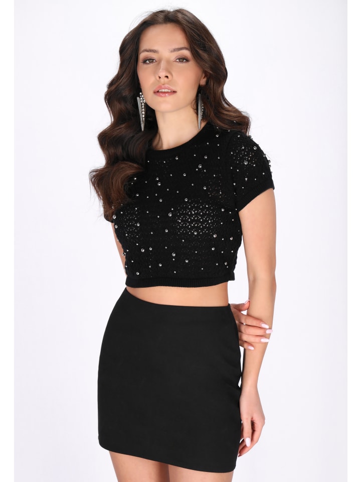 Стильная блузка прямого кроя укороченной длины, идеально сочетающая комфорт и декоративный элемент. Модель с круглым вырезом и короткими рукавами украшена изящной бисерной отделкой, добавляющей элегантности и нежного, праздничного настроения. Изготовленная из мягкой трикотажной ткани с ажурным узором, она обеспечивает комфорт и приятное ощущение уюта. Эта уютная и эффектная вещь из праздничной коллекции идеально подходит для особых случаев и стильных вечерних образов.