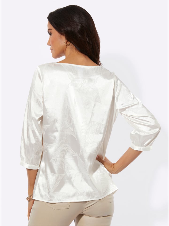 Жаккардовая блузка с узором из листьев непременно станет вашей любимой вещью. Слегка закругленный вырез-лодочка, вытачки на груди и рукава три четверти с узкими манжетами завершают образ.