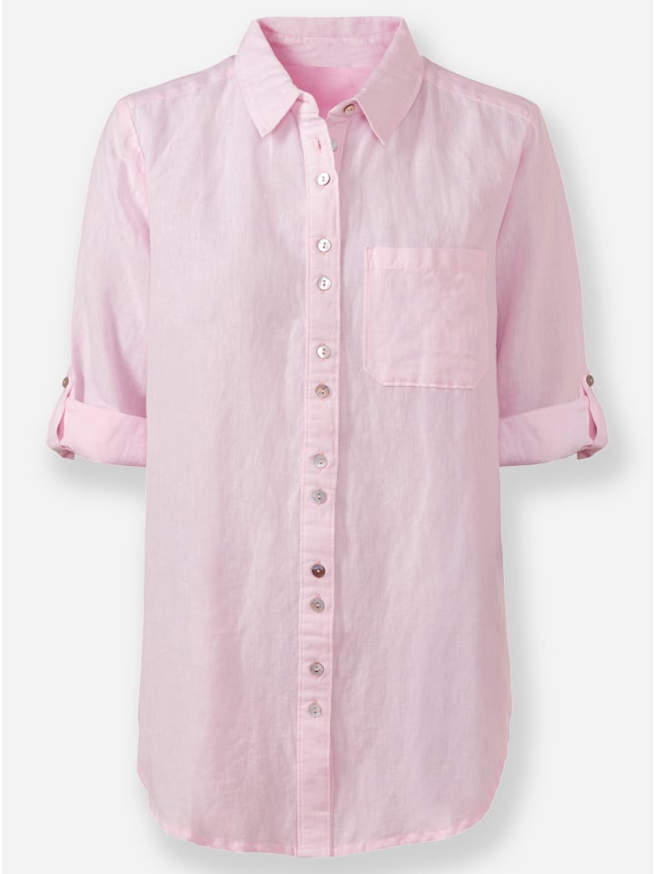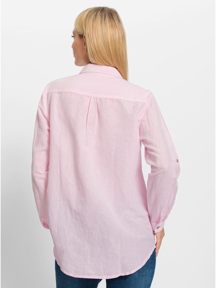 Длинная блузка в модном стиле и комфортного качества. Лестный силуэт, с воротником-стойкой, длинными рукавами и нагрудными карманами.