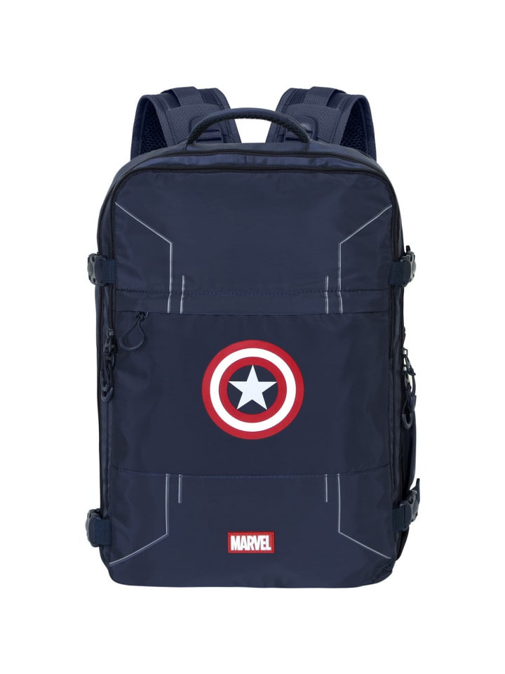 Этот стильный дорожный рюкзак в культовом дизайне украшен классическим логотипом в виде щита на передней части и ненавязчивыми рисунками в стиле комиксов внутри - идеально подходит для всех поклонников Капитана Америки! Этот большой дорожный рюкзак может похвастаться множеством продуманных функций, которые значительно упрощают путешествия. Соответствуя нормам провоза багажа, он изготовлен из водостойкого, сверхлегкого материала и надежно защищает содержимое от непогоды. Просторное основное отделение, оснащенное лямками и отдельным сетчатым карманом на молнии, предлагает достаточно места для одежды, туалетных принадлежностей и письменных принадлежностей. Два дополнительных кармана, открывающихся на 180°, упрощают упаковку и обеспечивают быстрый доступ к другим необходимым в путешествии вещам. Мягкое отделение для ноутбука защищает устройства до 17 дюймов, а водостойкий передний карман сохраняет документы в безопасности и сухости. Дополнительные боковые карманы предоставляют место для бутылок с водой или мелких предметов. Дышащая мягкая спинка и регулируемые плечевые лямки, усиленные прочной тесьмой, обеспечивают комфортное ношение. Четыре боковых компрессионных ремня позволяют гибко регулировать объем.