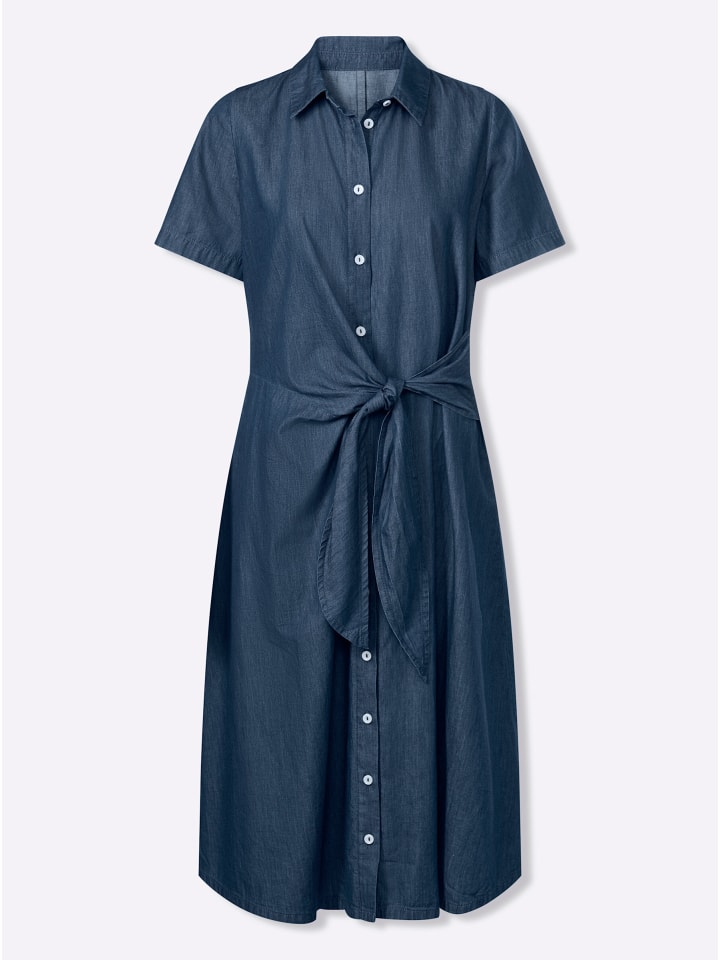Вам обязательно понравится это воздушное джинсовое платье! Оно не только невероятно удобно в носке, но и благодаря А-образному силуэту с запахом прекрасно подчеркивает фигуру. Платье имеет воротник рубашечного типа, застежку на все пуговицы и короткие рукава. Вытачки на талии сзади завершают образ. Особенности: - Застежка на все пуговицы сзади - Лестный дизайн с запахом - Вытачки на спине - Застежка на все пуговицы - Легкая, летняя джинсовая ткань. Материал: 100% хлопок