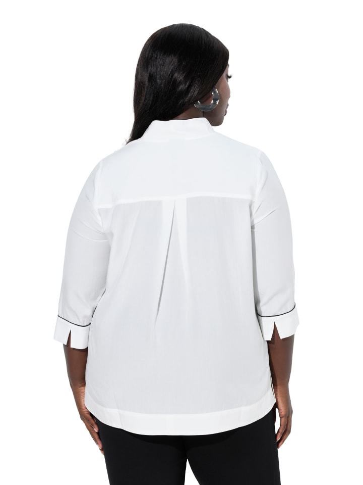 Блузка из лиоцелла, А-силуэта, изготовлена из натурального мягкого и прохладного лиоцелла с декоративной окантовкой - по воротнику-стойке с V-образным вырезом и по краям рукавов 3/4 с разрезами. Боковые разрезы для дополнительного комфорта.
