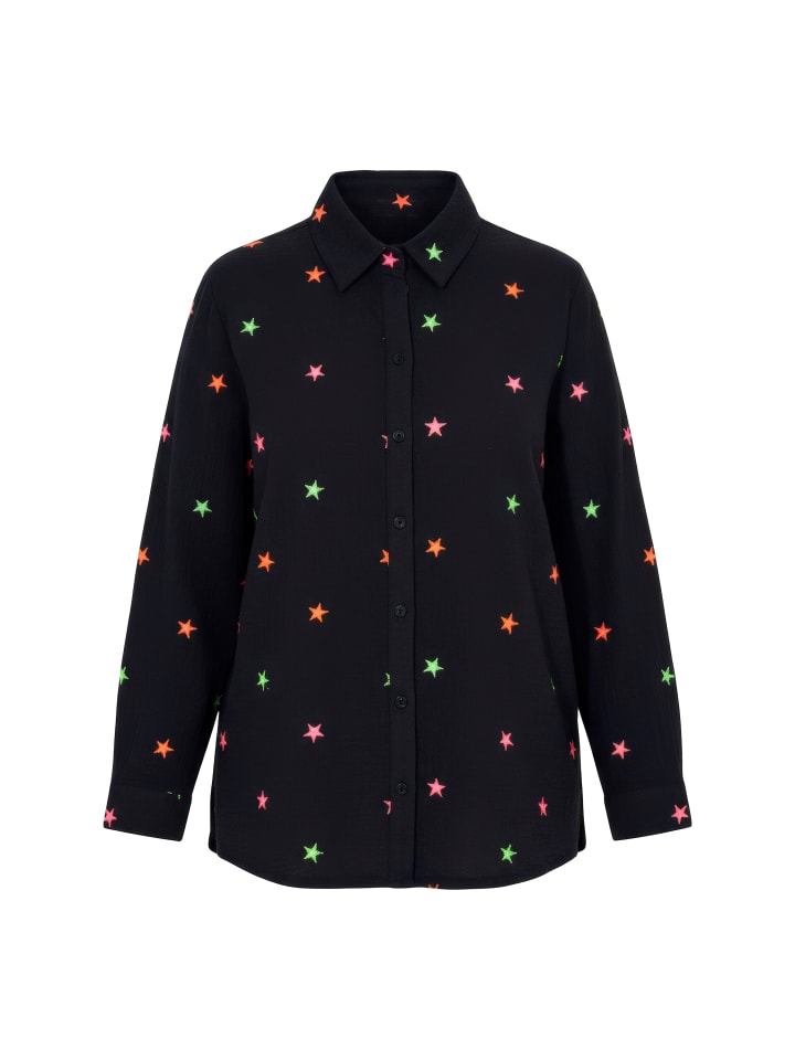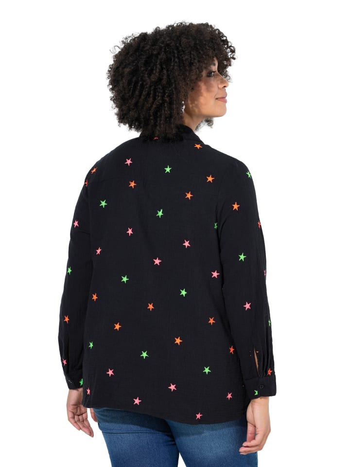 Свободная муслиновая блузка с тонкой текстурой и красочной вышивкой в виде звезд. Рубашечный воротник, планка на пуговицах, длинные рукава с манжетами.