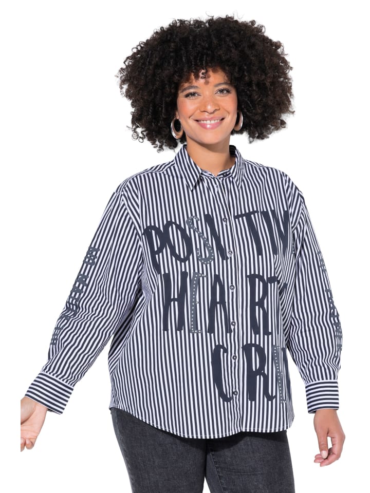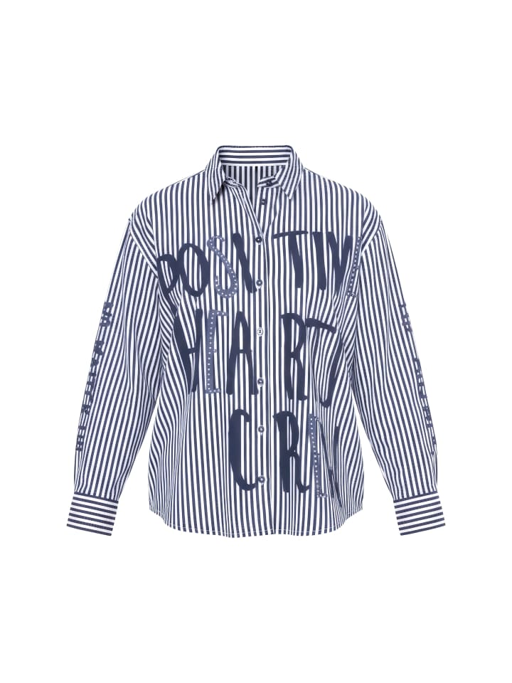 Блузка-рубашка свободного кроя с тонкими полосками и сверкающим логотипом XL, украшенным пайетками. Воротник рубашечного типа, приспущенные плечи, длинные рукава с манжетами. Слегка закругленный низ.
