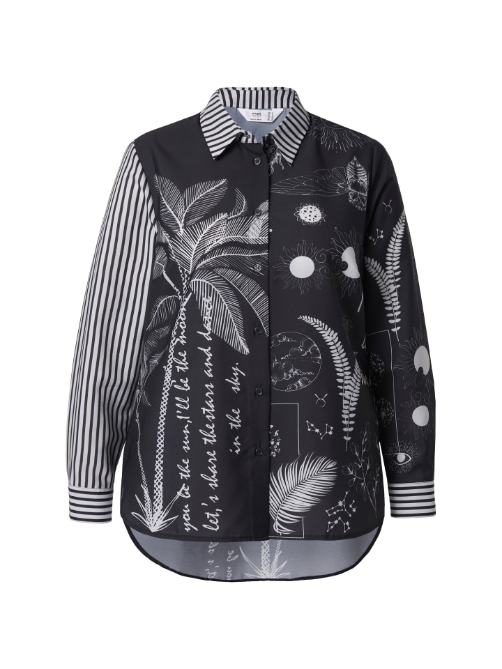Длинная, свободная блузка из легкой тканой ткани с сочетанием полосок и модных принтов. Имеет воротник рубашечного типа, приспущенные плечи и длинные рукава с манжетами. Длина подола сзади примерно на 10 см больше.