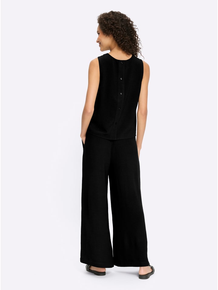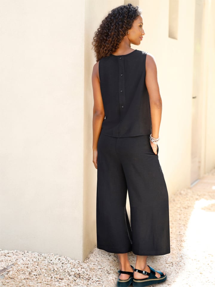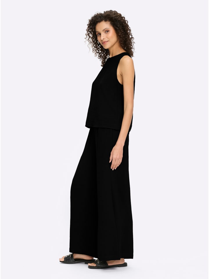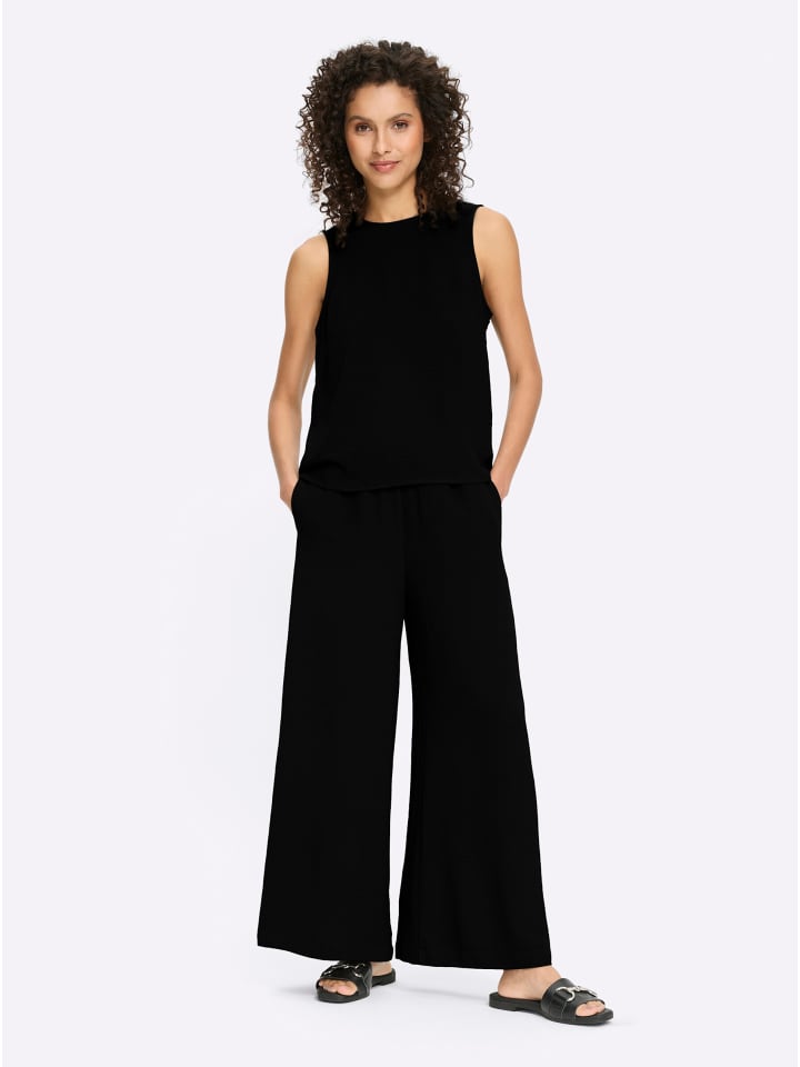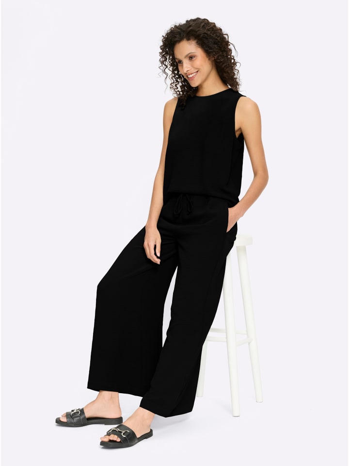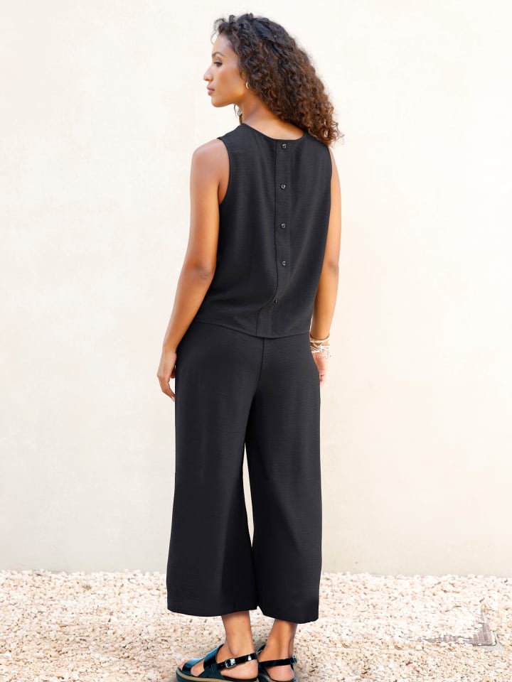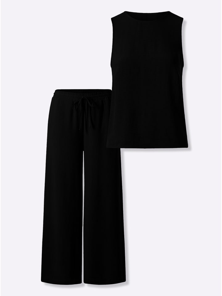 Блузка + брюки: Модный комплект из струящейся, комфортной ткани. Блузка имеет слегка А-образный силуэт, круглый вырез и декоративную застежку на пуговицах сзади. Длина около 56 см. Брюки укороченные, с широкими штанинами. Они имеют эластичный пояс со шнурком и завязкой, а также боковые карманы. Стандартная посадка. Комфортный крой. Ширина штанины внизу около 81 см. Изготовлены из переработанного полиэстера.