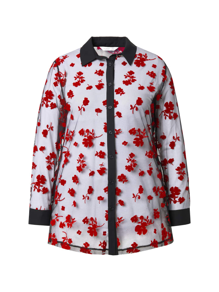 Блузка, удобный стандартный крой, из слегка прозрачной ткани с цветочным флоковым принтом. Рубашечный воротник, планка на пуговицах, длинные рукава с манжетами.
