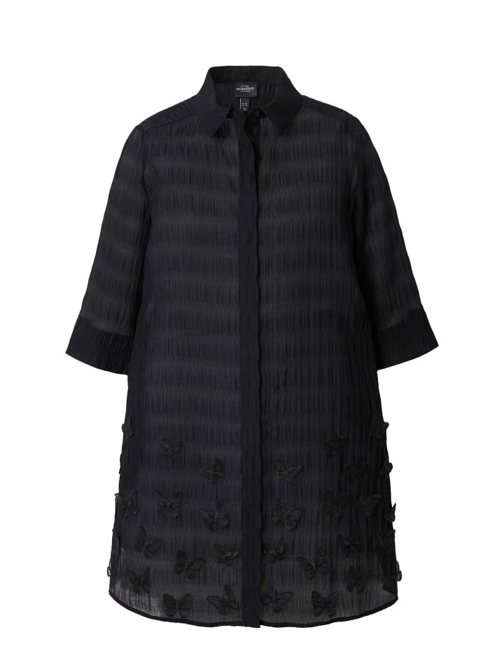 Длинная блузка, удлиненный А-образный силуэт, из слегка прозрачной жатой ткани с элегантной аппликацией в виде бабочки по низу. Воротник-стойка, потайная планка на пуговицах, длинные рукава с разрезами. Боковые разрезы для дополнительного комфорта.