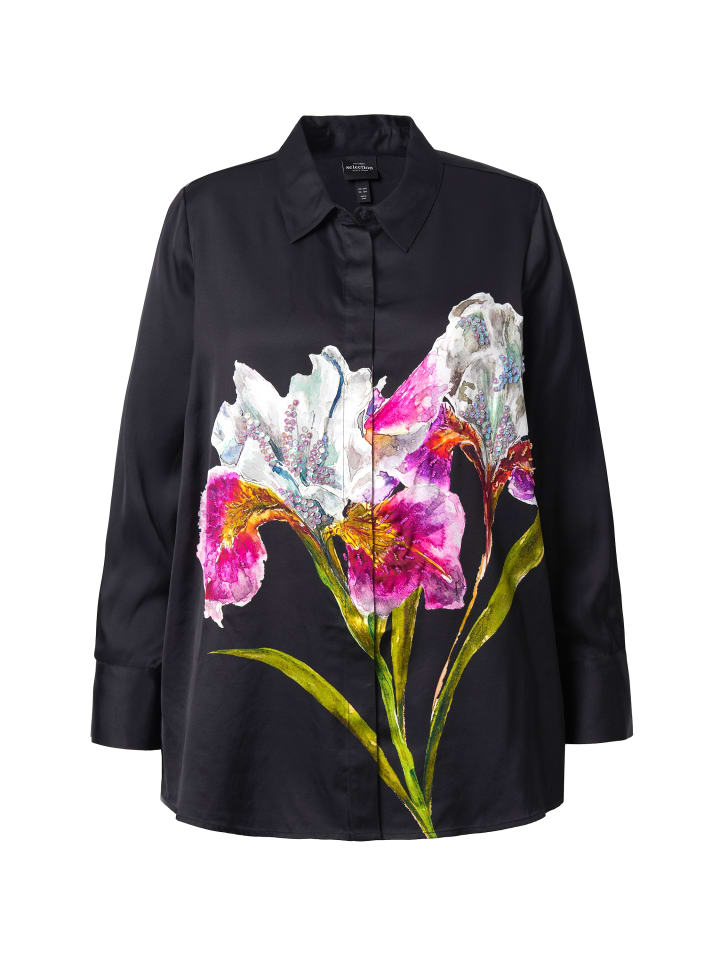 Блузка А-силуэта из переливающегося вискозного атласа с роскошной жемчужной вышивкой на узоре в виде ирисов. Воротник-стойка, потайная планка на пуговицах, длинные рукава с манжетами. Нижний край с боковыми разрезами для дополнительного комфорта.