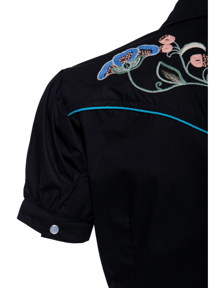 Цветы, стиль вестерн и рок-н-ролл! Изысканная вышивка спереди и сзади придает этой блузке нотку вестерн-романтики с оттенком рокабилли. Короткие рукава-фонарики с манжетой на одной пуговице, контрастная окантовка и женственный крой добавляют винтажного шарма вашему стилю. Скрытая застежка на крючки и петли обеспечивает гладкий перед и делает эту блузку настоящей приманкой для глаз, а также удобной в ношении. Изготовленная из чистого хлопка, она обеспечит вам комфорт в жаркие дни и долгие ночи танцев.
