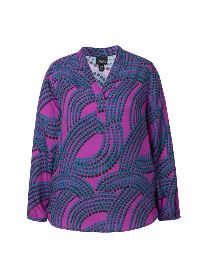 Блузка классического кроя из мягкой вискозы с узором в горошек. Имеет воротник-стойку, V-образный вырез и декоративную планку на пуговицах. Длинные рукава, боковые разрезы для дополнительного комфорта.