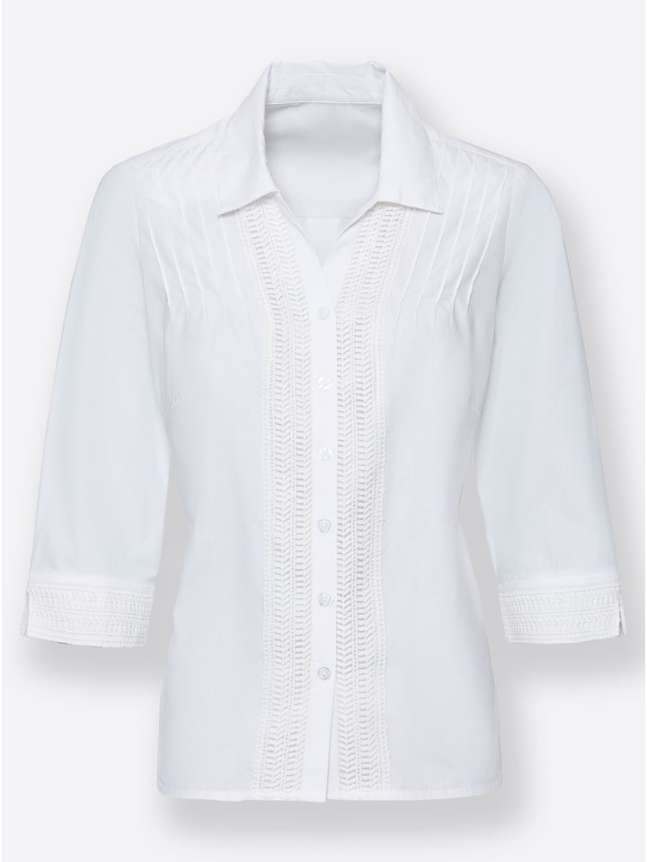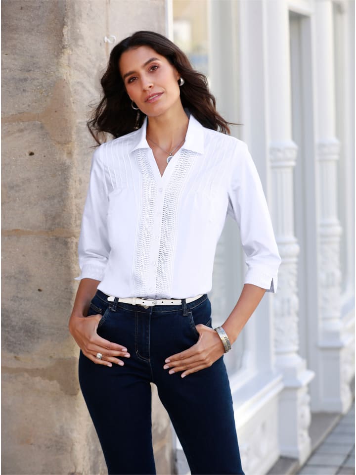 Особый шарм этой блузке придают пришитые изящные кружевные ленты вдоль планки с пуговицами и на манжетах рукавов 3/4 с разрезами, а также декоративные складки на плечах спереди. Она имеет открытый воротник рубашечного типа с V-образным вырезом. Идеальную посадку обеспечивают вытачки на груди и кокетка на спине со складкой. - 50% хлопок - с кружевом - с изысканной отделкой складками. Материал: - 50% хлопок - 50% полиэстер