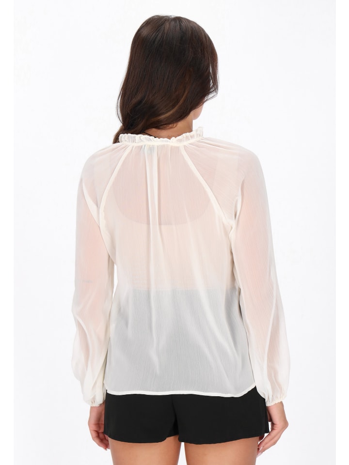 Эта романтичная блузка из коллекции Faina - сочетание утонченности и элегантности. Изготовленная из легкого, прозрачного шифона, она восхищает своим нежным блеском и женственным очарованием. Воротник с оборками и небольшим разрезом на вырезе добавляет неповторимый характер, а длинные пышные рукава-епископ с застежкой на пуговицы - нотку изысканности. Свободный крой обеспечивает комфорт и свободу движений, а гладкий узор делает блузку идеальной для романтических ужинов или особых случаев. Стильная, женственная и вневременная - идеальный выбор для ценителей утонченной элегантности.