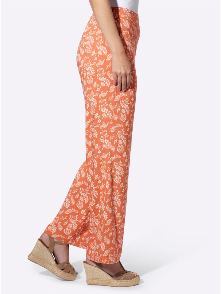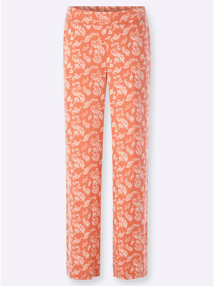 Брюки с модным принтом «пейсли». С эластичным поясом сзади. Стандартная посадка, удобный крой. Широкие прямые штанины. Ширина штанины внизу около 56 см. Изготовлены из комфортной вискозы качества ECOVERO от Lenzing.