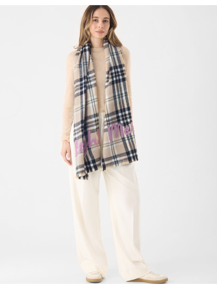 Этот тканый шарф бежевого цвета сочетает в себе классический клетчатый узор с современной вышивкой. Мягкая поверхность обеспечивает комфорт при ношении, а броская надпись добавляет дизайну неповторимый шарм.