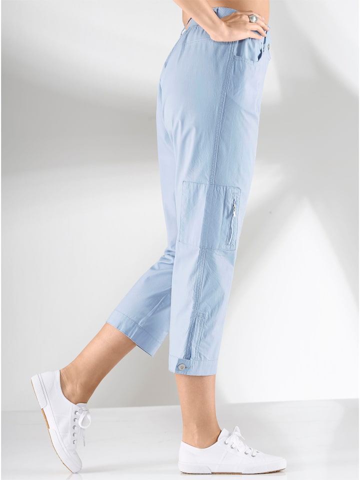 Повседневные брюки длиной до икр с удобным ребристым эластичным поясом, передняя панель гладкая. Застежка на пуговицу и молнию, шлевки для ремня. Кокетка сзади и эластичная ткань обеспечивают отличную посадку. Два передних кармана и один боковой карман на молнии. Особенно практичная деталь - молния с разрезом внизу штанины.