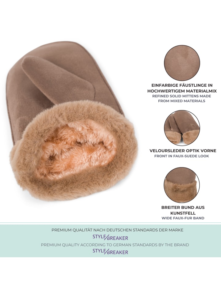 Теплые однотонные варежки styleBREAKER из сочетания материалов: ладони с имитацией замши и манжета из искусственного меха.