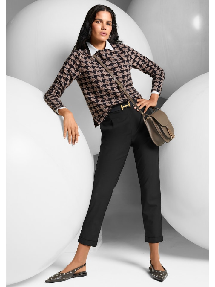 Когда речь идет о стильном и элегантном образе, эти брюки - лучший выбор. Высококачественная эластичная ткань невероятно удобна и не сковывает движений. Частично эластичный пояс легко надевается и удобно сидит на бедрах. Складки спереди подчеркивают формальный вид, придавая дизайну нотку сдержанной элегантности и создавая немного больше пространства в области бедер. Брюки сужаются к низу, завершаясь модным подворотом. Незаметные боковые карманы органично вписаны в дизайн и обеспечивают практичное хранение, а декоративная окантовка сзади ненавязчиво намекает на карманы. Модный партнер для стильных образов - будь то деловые встречи, особые случаи или элегантный повседневный вариант.