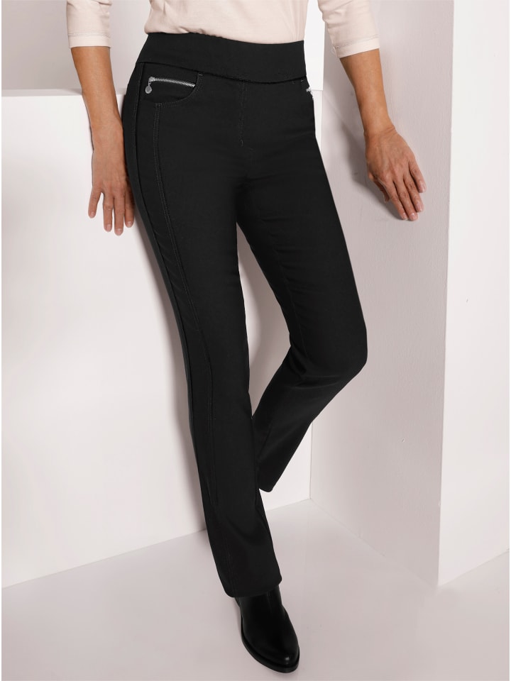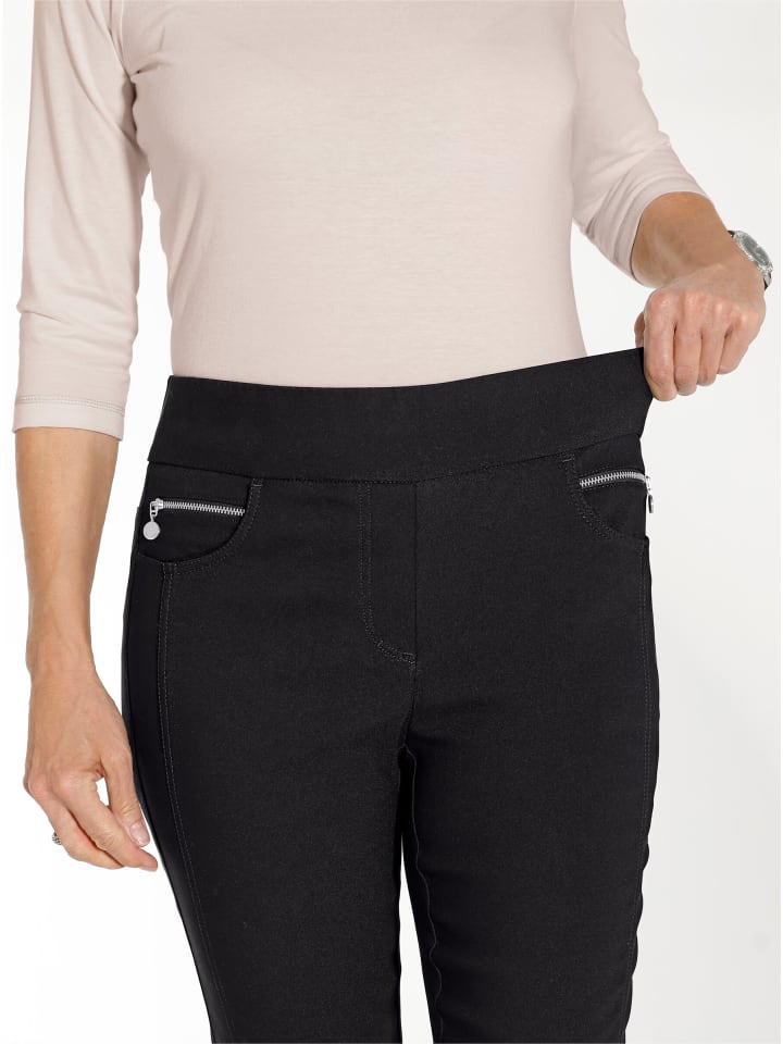Брюки из высококачественной эластичной ткани. Исключительно мягкая, сохраняющая форму эластичная ткань. Узкий крой и невероятный комфорт благодаря эластичному поясу. Регулируемая кокетка сзади. Передние карманы с декоративными молниями. Ширина штанины внизу около 32 см. Ремень в комплект не входит.