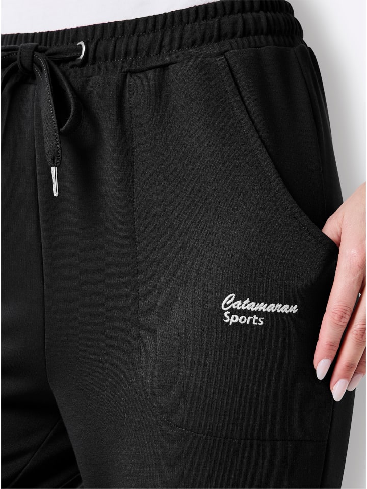 Эти спортивные брюки от Catamaran Sports одновременно шикарны и элегантны. Приятные на ощупь, мягкие, с легким блеском благодаря смеси модала. Эластичный пояс со шнурком и внешней завязкой позволяет регулировать ширину по фигуре. Два боковых кармана украшены декоративными, видимыми швами. Штанины имеют фиксированные отвороты.