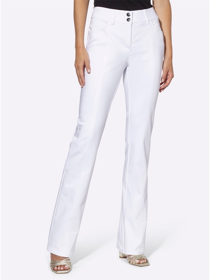 Брюки с утягивающим эффектом в модном стиле «буткат». Вшитая сетчатая ткань для создания привлекательного силуэта. Эластичная ткань, формирующая фигуру. Стандартная посадка. Зауженный крой. Ширина штанины внизу около 47 см.