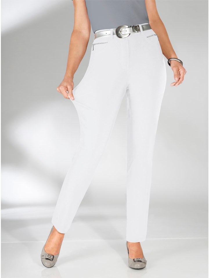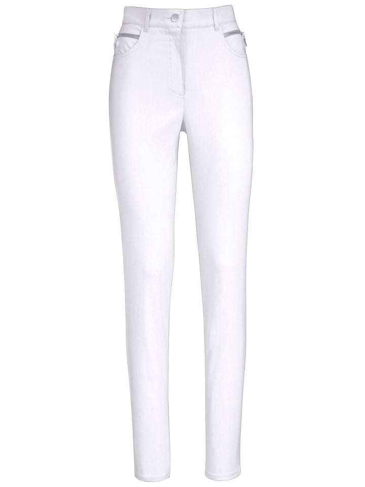 Эти брюки идеально сидят, обеспечивают прекрасную свободу движений и всегда сохраняют свою форму! Эластичные брюки с застежкой на пуговицу и молнию, а также петлями для ремня. Два закругленных кармана и два декоративных кармана с молниями. Втачный пояс. Ширина штанины внизу около 36 см.