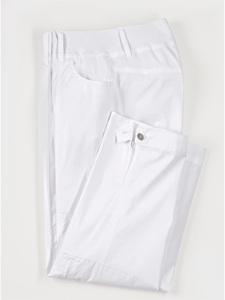 Повседневные брюки длиной до икр с удобным ребристым эластичным поясом, передняя панель гладкая. Застежка на пуговицу и молнию, шлевки для ремня. Кокетка сзади и эластичная ткань обеспечивают отличную посадку. Два передних кармана и один боковой карман на молнии. Особенно практичная деталь - молния с разрезом внизу штанины.