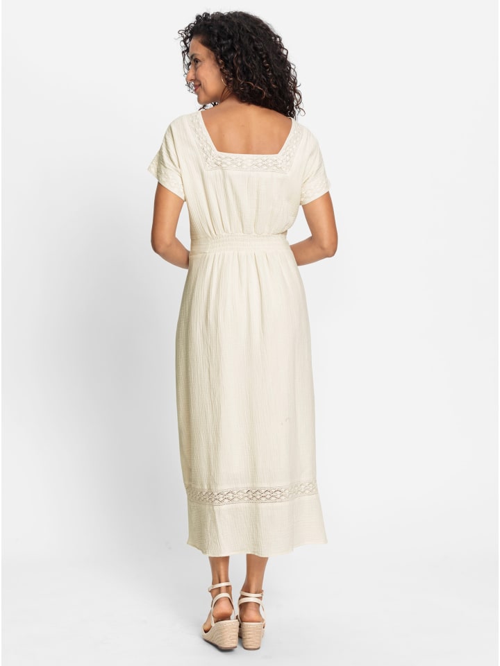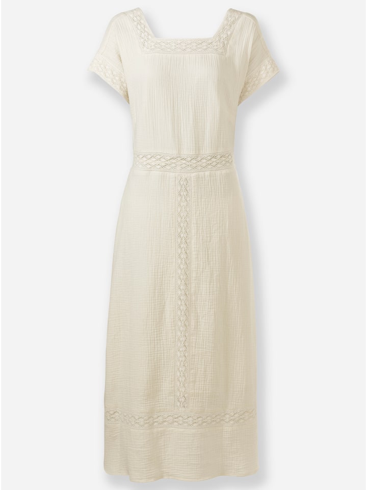 Праздничное настроение, которое вы можете носить! Потрясающее платье из приятного для кожи, модного муслина с кружевной отделкой по квадратному вырезу спереди и сзади, а также на манжетах рукавов. Кружево на талии и мягкая сборка на спине выгодно подчеркивают фигуру. Визуально удлиняющее кружево украшает переднюю часть юбки и подол. Платье имеет лестный А-образный силуэт со спущенными плечами. Передняя и задняя части полностью на подкладке. Поддерживает инициативу «Хлопок, произведенный в Африке».