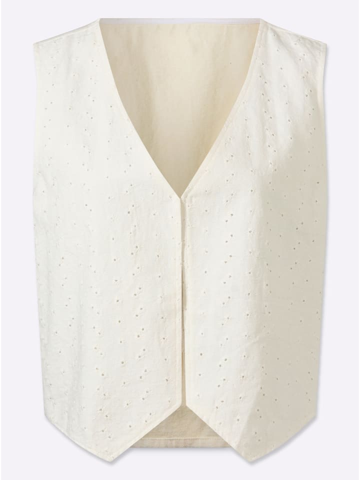 Этот короткий жилет, который можно носить с брюками или юбкой, поверх рубашки или топа, не только невероятно моден, но и удивительно универсален. Передняя часть украшена игривой вышивкой с непрозрачной подкладкой. Он имеет слегка приталенный крой с V-образным вырезом и застежкой на крючок.