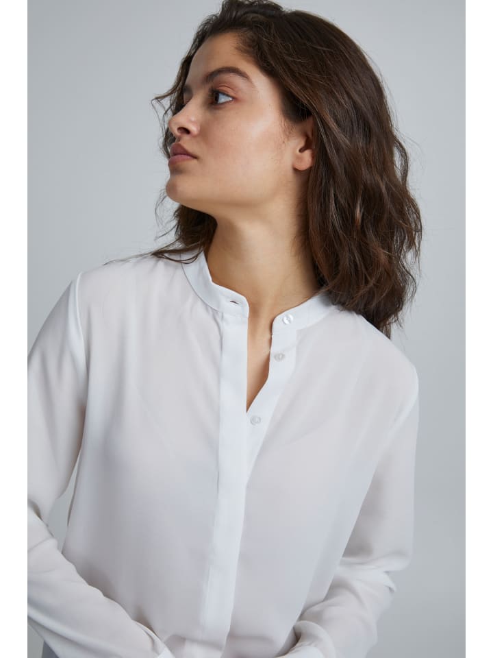 Минималистичная блузка прямого кроя, потайной застежки на пуговицах и воротника-стойки. Длинные рукава и струящийся закругленный подол. Стирать при 40 градусах, не отбеливать, не сушить в сушильной машине, гладить при температуре не выше 110°C, только химчистка. Верхний материал: 100% переработанный полиэстер. - Модная блузка от ведущего датского бренда. - Удобна в ношении благодаря высококачественному материалу. - Простая и универсальная. - Удобный крой. - Для современного образа на отдыхе или работе. - Прямой крой с четкими линиями. - Воротник-стойка. - Потайная застежка на пуговицах спереди. - Длинные рукава с небольшими манжетами. - Закругленный, удлиненный подол. Материал: 100% полиэстер.