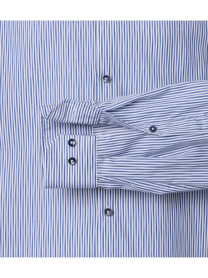 Эта деловая рубашка впечатляет своим современным, приталенным кроем и исключительным комфортом, обеспечивая комфорт даже в долгие рабочие дни в офисе или на официальных мероприятиях. Дизайн с длинными рукавами и воротником-стойкой «акулий» одновременно элегантен и современен. Благодаря легкому в уходе материалу, отпадает необходимость в трудоемкой глажке, оставляя больше времени для повседневной жизни. Тонкий полосатый узор придает рубашке неповторимый вид, который дополнительно подчеркивается принтом на поверхности ткани. Ее легко сочетать с блейзером, классическими брюками, жилетом или галстуком-бабочкой и нагрудным платком. Отсутствие нагрудного кармана способствует созданию аккуратного, лаконичного образа. - Современный крой / Приталенный крой - Воротник-стойка «акулий» - Тонкий полосатый узор - Принт на поверхности ткани - Исключительный комфорт Материал: 100% хлопок