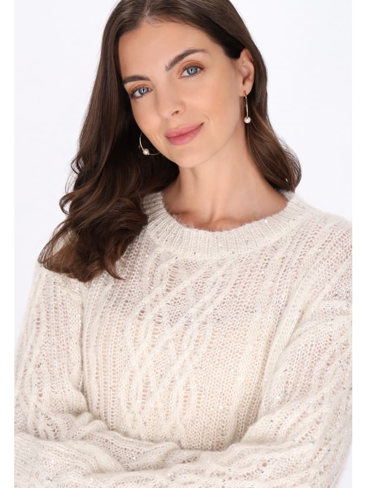 Добавьте блеска своим повседневным нарядам с помощью вязаного свитера из коллекции Usha. Классический крой с круглым вырезом и длинными рукавами обеспечивает комфорт и свободу движений. Ажурный узор «косичка» украшен нежными пайетками и блестящей нитью, что придает ему неповторимый характер. Благодаря мягкой структуре вязки свитер не только уютный и комфортный, но и идеально подходит для повседневной носки.