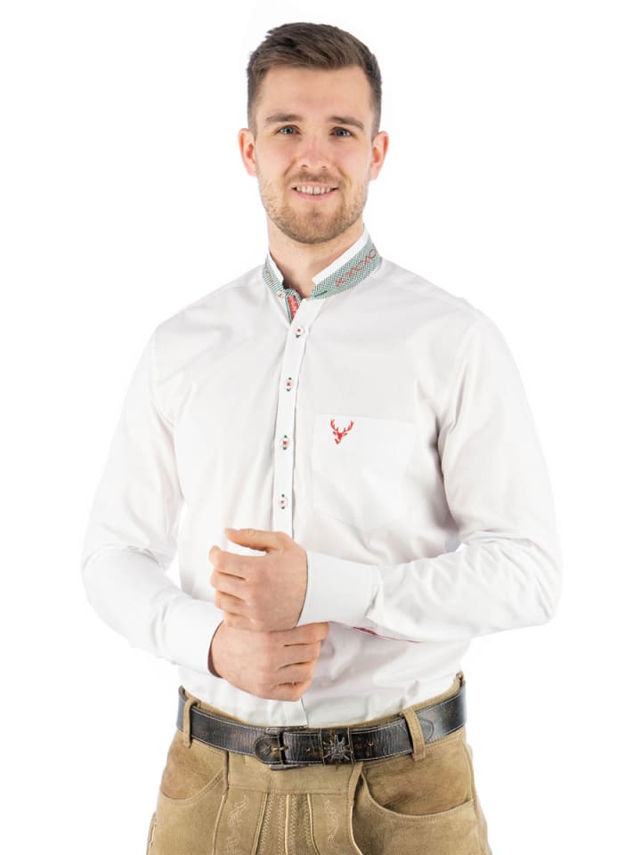 Красная вышивка в виде оленьих рогов на нагрудном кармане, контрастная зеленая клетка на воротнике-стойке и красная отделка на планках рукавов - эта белая рубашка с гордостью демонстрирует свое наследие OS Trachten. Красно-зеленая цветовая гамма повторяется на планке с пуговицами. Рубашку можно носить - как показано здесь - с ледерхозенами, но она также идеально сочетается с джинсами. Доступна в облегающем крое от размеров 35 до 53. А чтобы вы носили рубашку часто и с удовольствием, 20% полиэстер в сочетании с хлопком облегчает уход за ней. Сделано в Европе.