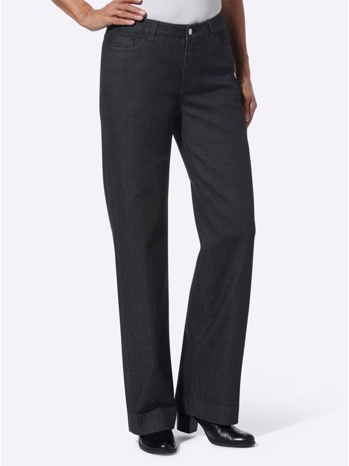 Классические джинсы с пятью карманами и модными широкими штанинами. Идеальная посадка благодаря приталенному поясу с петлями для ремня и кокетке сзади. Застежка на пуговицу и молнию спереди. Характерные джинсовые швы и модный широкий низ. Удобная, мягкая эластичная ткань. Ширина штанины внизу около 50 см. Ремень в комплект не входит.