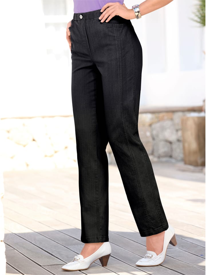 Джинсы, подчеркивающие вашу фигуру: зауженный крой благодаря боковому шву, расположенному спереди. Удобный фасон без застежек, эластичный пояс по всему периметру и застежка на пуговицу и молнию. Боковые карманы. Ширина штанины внизу около 40 см.