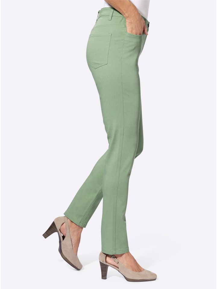 Суперкомфортные! Эти эластичные брюки с четырьмя карманами, застежкой на пуговицу и молнию, а также петлями для ремня, обеспечивают свободу движений. Ширина штанины внизу около 34 см.