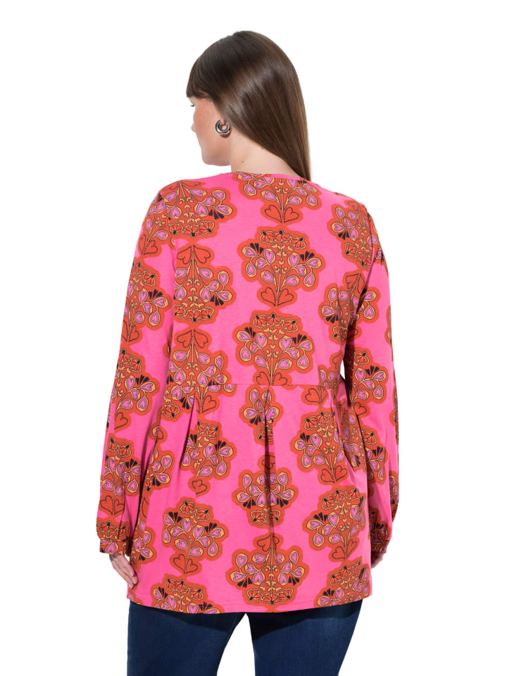 Удобная рубашка А-силуэта из высококачественного трикотажа купромикс с принтом. Квадратный вырез горловины, изогнутый горизонтальный шов с годетными складками для комфортной ширины подола. Длинные рукава с эластичными манжетами.