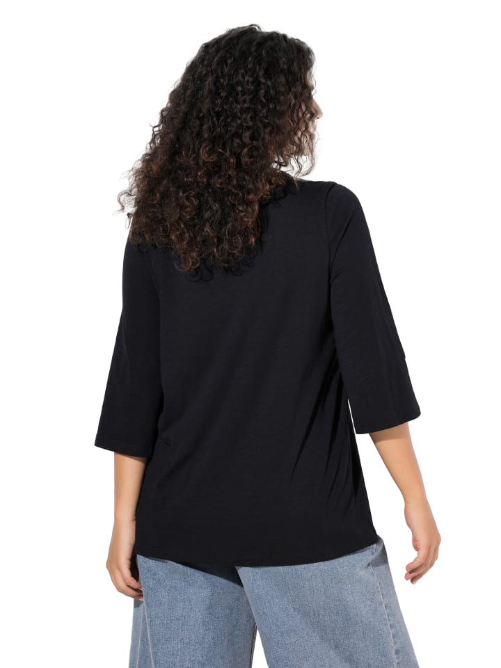Футболка А-силуэта из мягкого трикотажа с большим логотипом на передней части. Особенность: широкие рукава три четверти, расклешенные книзу. Круглый вырез.