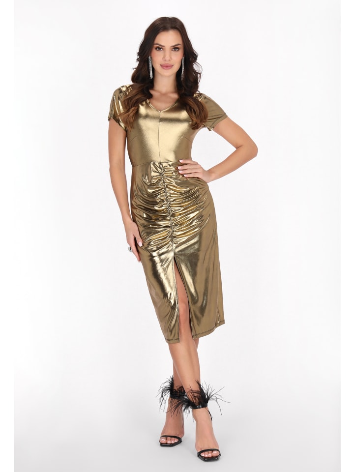 Это стильное платье миди излучает элегантность благодаря развевающемуся V-образному вырезу и коротким рукавам, выполненным в удобном стандартном крое. Изготовленное из блестящей трикотажной ткани, оно добавит вашему образу изысканности. Разрез спереди обеспечивает свободу движений, а тонкие складки создают красивую текстуру. Идеально подходит для вечеринок или особых мероприятий, это эффектное платье из коллекции Fashion Look гарантирует, что вы будете блистать в любой ситуации.