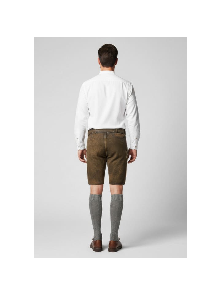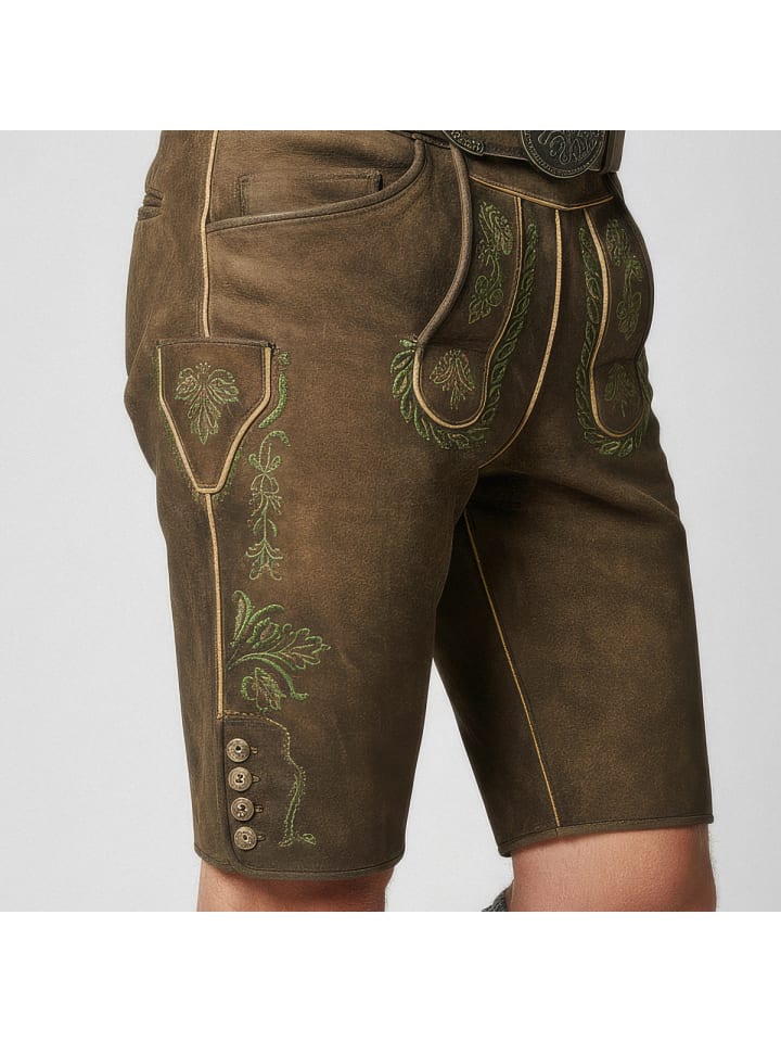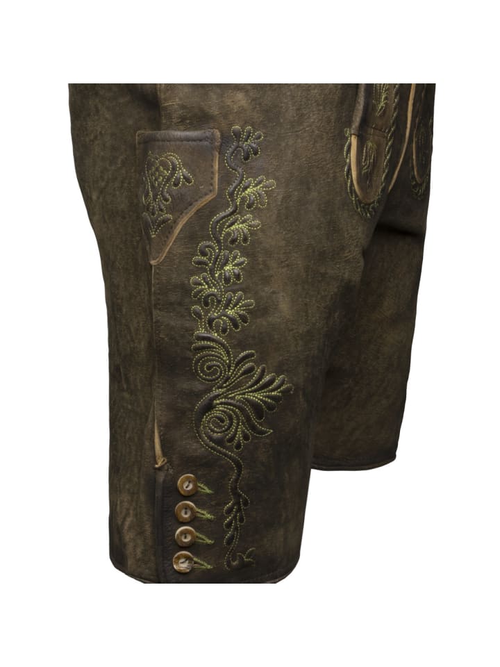 Мужские кожаные бриджи Bertram впечатляют не только своим красивым цветом, но прежде всего вышивкой на нагруднике и штанинах. Изготовленные из высококачественной кожи, они отличаются особой мягкостью и обеспечивают исключительный комфорт. Нагрудник застегивается на роговые пуговицы, а ширина штанин регулируется с помощью пуговиц. Кожаный пояс с антикварной пряжкой обеспечивает дополнительную поддержку. Помимо переднего и заднего карманов, бриджи также имеют небольшой вышитый карман на штанине. Эти кожаные бриджи станут настоящим украшением как для повседневной носки, так и для торжественных случаев.