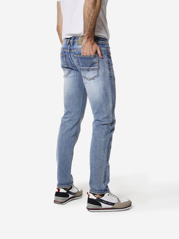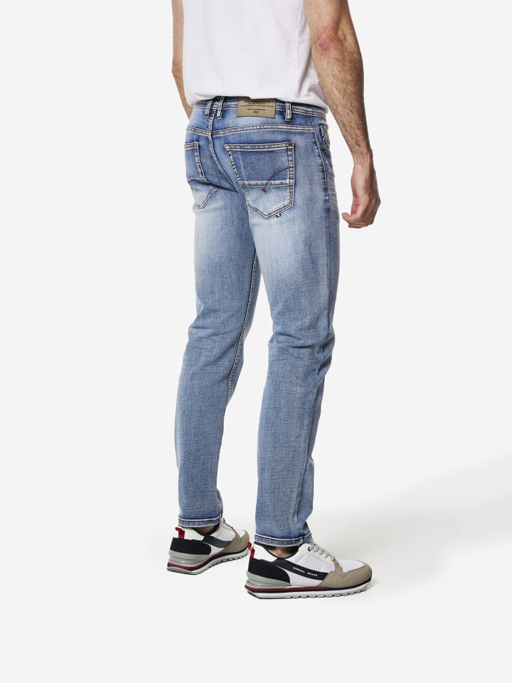 Джинсы классического кроя. Застежка спереди на молнию и пуговицу. Состав: 75% хлопок, 23% полиэстер, 2% эластан.