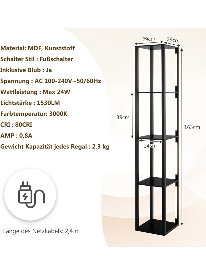 Описание: Этот напольный светильник «2 в 1» сочетает в себе лампу и полку в одном устройстве и станет отличным выбором для вашего дома! Светодиодные лампы с 3-ступенчатой регулировкой яркости обеспечивают яркий свет (19 Вт), теплый свет (10 Вт) и уютный свет (2 Вт) на ваш выбор. Вы также можете вращать светодиодные планки на 360 градусов, чтобы осветить ваши ценные коллекции или любой другой желаемый угол. Чтобы выключить свет, просто нажмите ножной выключатель. Что касается хранения, то есть 4 полки, которые создадут дополнительное пространство для ваших вещей, таких как фоторамки, книги, комнатные растения и украшения.