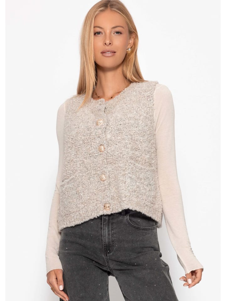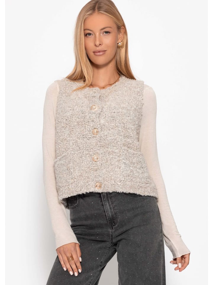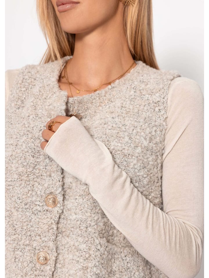 Этот жилет отличается стильным букле-покрытием, его фактурная поверхность создает модный и одновременно уютный вид. Классическая застежка на пуговицах с декоративными пуговицами и два накладных кармана подчеркивают его очарование. Благодаря прямому крою и удобной длине жилет идеально подходит для ношения поверх рубашек, блузок или тонких свитеров. Мягкая, объемная текстура не только обеспечивает тепло, но и добавляет современный акцент, дополняющий самые разные образы. Будь то повседневное сочетание с джинсами или эффектный акцент поверх женственных платьев, этот букле-жилет станет универсальным элементом стиля в любом гардеробе. - В розовом цвете: Модель носит размер S, рост 174 см; В серо-бежевом и черном цветах: Модель носит размер S, рост 172 см. В магазине Braun: Модель носит размер S, рост 177 см.